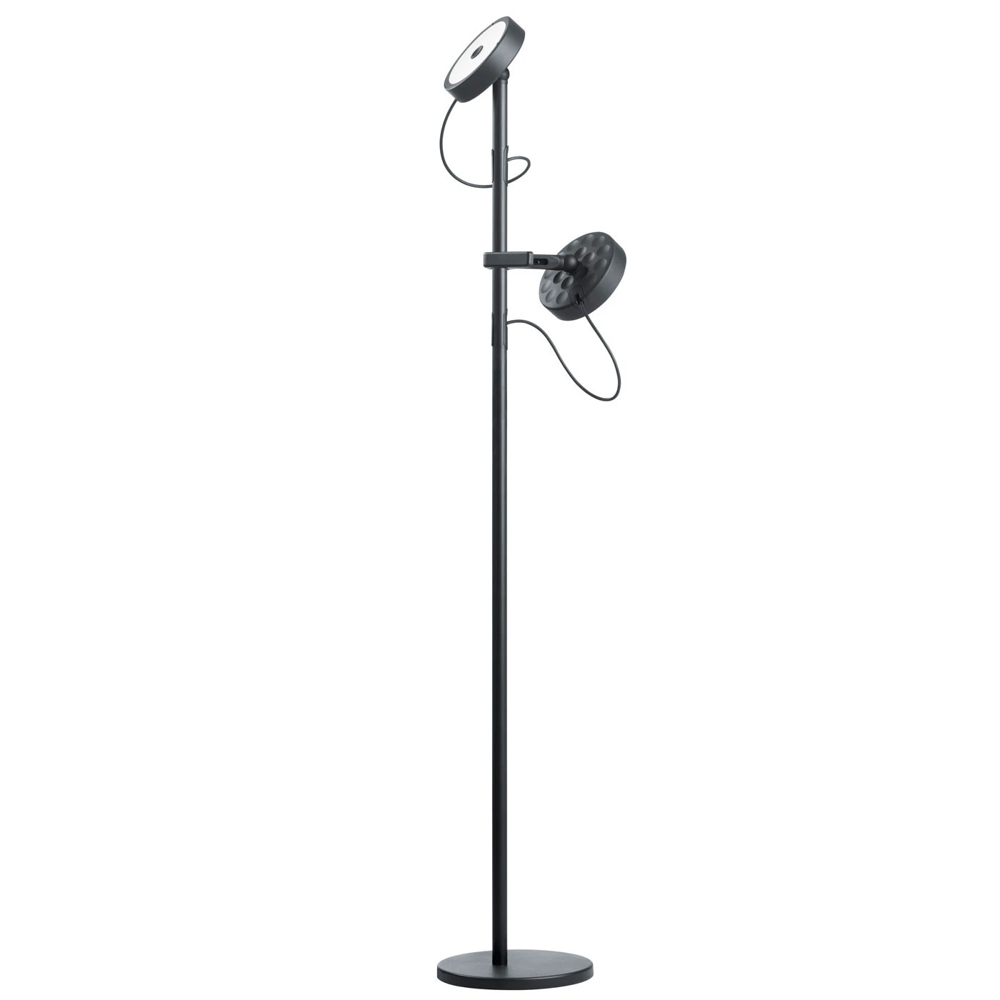 | Abmessungen | Höhe 133,5 cm, Spotdurchmesser 14,3 cm, Spot Dicke 3,8 cm, Rohrdurchmesser 2,25 cm, Fußdurchmesser 23,1 cm, Kabellänge 2 m, Gewicht 10,5 kg. |