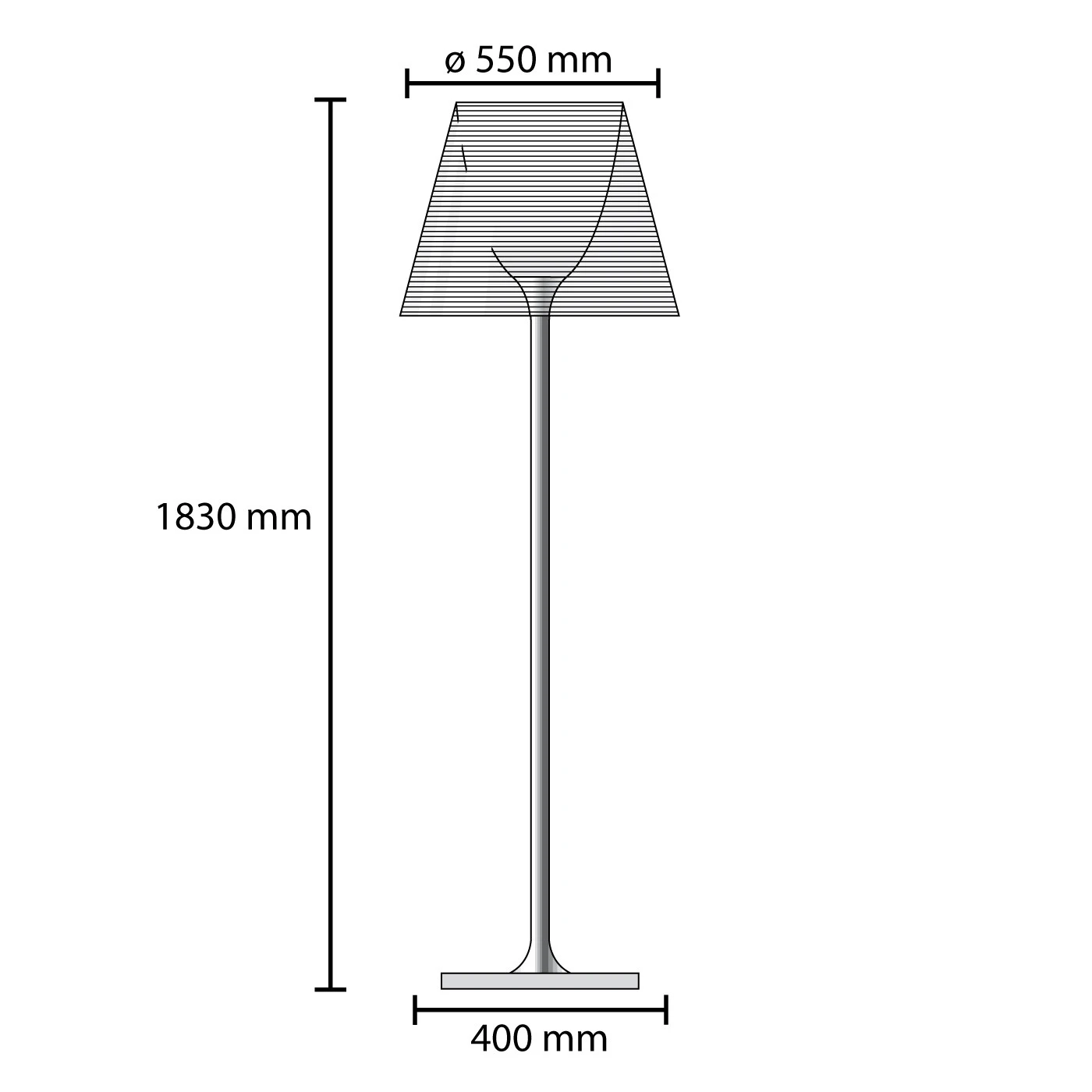 | Abmessungen | Höhe 183 cm, Schirmdurchmesser 55 cm, Schirmhöhe 44,5 cm, Fußplatte 40 x 40 cm, Gewicht 14 Kg. |
